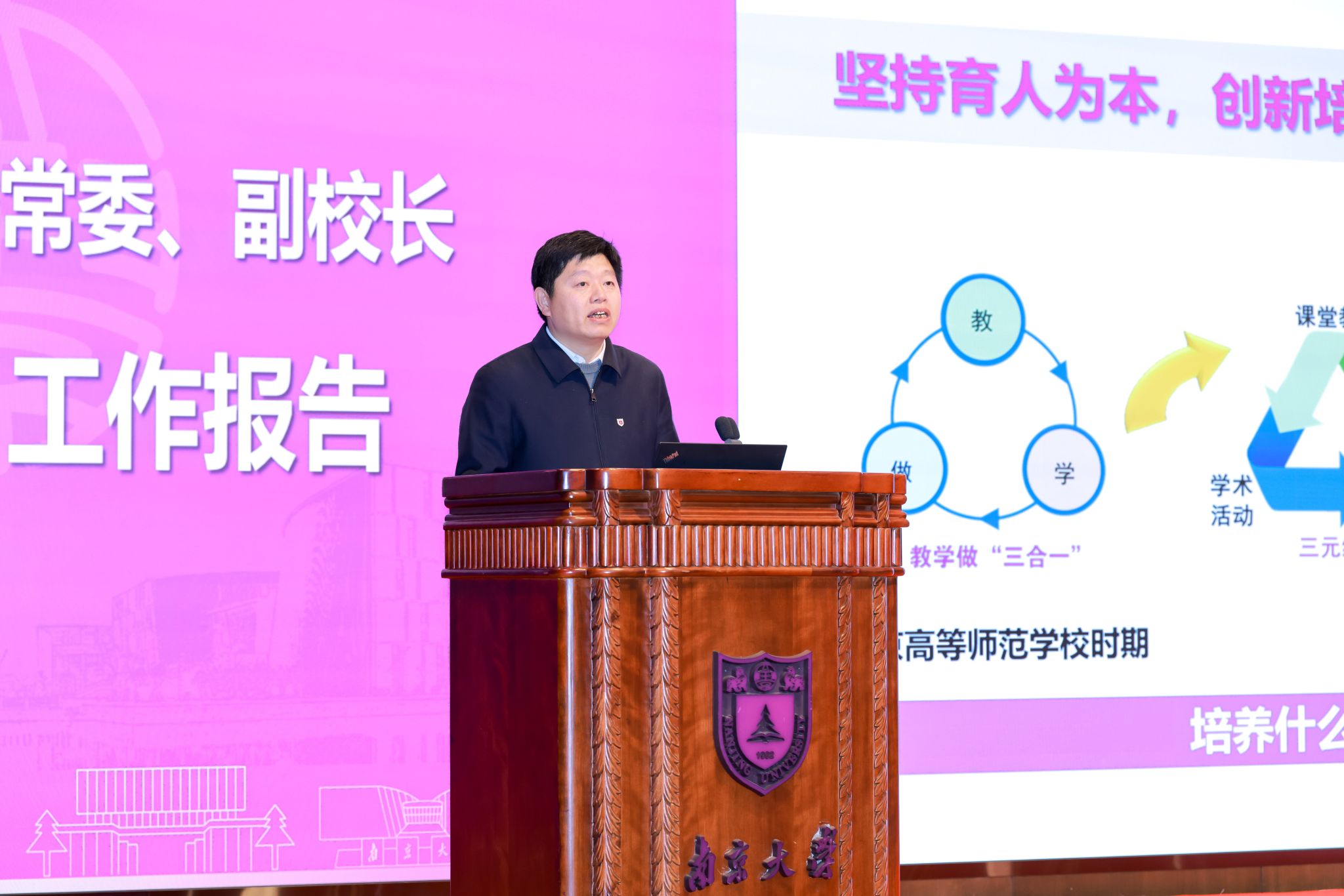 Tan Tieniu said that this meeting was held during the critical period of the progress towards the national strategic goal of building a strong nation in education, which is of great significance for deeply analyzing the new situation and challenges faced by undergraduate education and teaching, comprehensively summing up the work of the previous stage, and planning and deploying reform tasks and initiatives of the next stage. With regard to the reform of undergraduate education and teaching at Nanjing University, he put forward three requirements: firstly, to strengthen the sense of mission, innovation and benchmarking, and accurately grasp the new situation of the reform of undergraduate education and teaching; secondly, to focus on matching the needs of the country, the characteristics of the times and the personalized and comprehensive development of the students, and strive to lead the new direction of the reform of undergraduate education and teaching; and thirdly, to keep the direction of the reform firmly in mind and plan the reform programme, in order to turn a new leaf for undergraduate education and teaching.