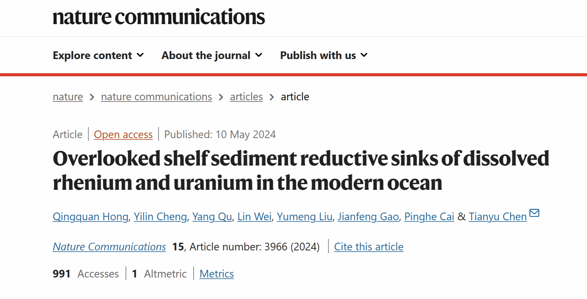 Citation: Hong Q., Cheng Y., Qu Y., Wei L., Liu Y., Gao J., Cai P., Chen T.*, 2024. Overlooked shelf sediment reductive sinks of dissolved rhenium and uranium in the modern ocean. Nature Communications 15, 3966. https://www.nature.com/articles/s41467-024-48297-y.