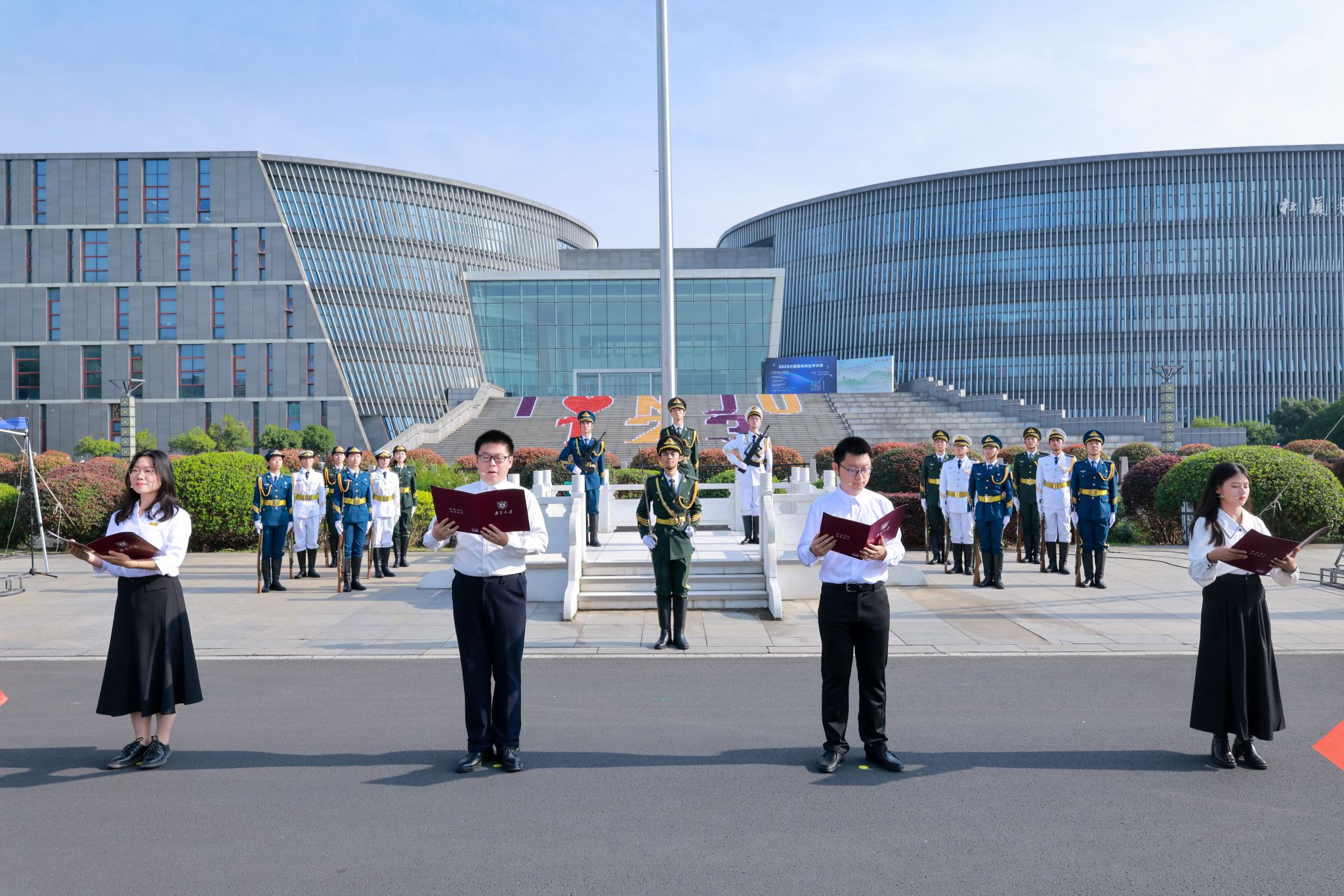 到祖国和人民最需要的地方发光发热,为中国式现代化建设贡献青春力量。四位学生代表为校庆献词,他们以青春之名,向母校深情告白。外国语学院2022 级硕士研究生张颖熔六年前投身中俄联合考古征程,在“一带一路”倡议的实践中,用专业译笔串联起中外交流的纽带,毕业后她将以新华社驻外记者的新身份用行动讲好中国故事;从青海支教到贵州选调,马克思主义学院 2022 级硕士研究生猫芳选择“到西部、到乡村、到基层”,坚持投身乡村振兴一线,展现了新时代中国青年昂扬向上的精神风貌和强国有我的责任担当;即将赴海外深造的物理学院2021级本科生江啟诚心怀强国之志,在基础学科领域不断探索,立志攻破技术壁垒,为高水平科技自立自强贡献力量;现代工程与应用科学学院2021级博士研究生尹知谦深刻体会到个人科研理想与国家发展的紧密联结,潜心微波光子学研究,力求攻克光芯片难题,投身国防军工,筑梦大国重器。