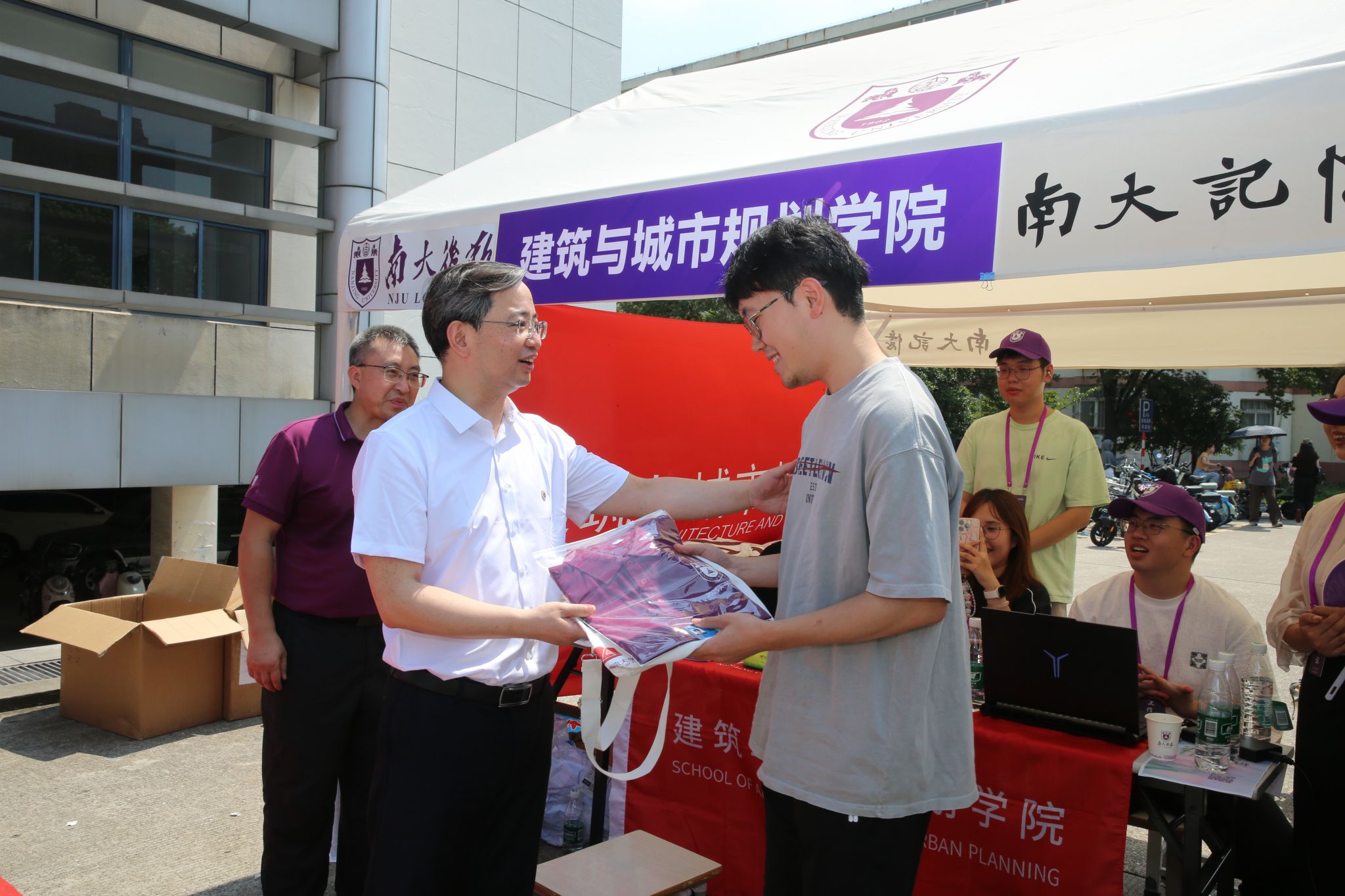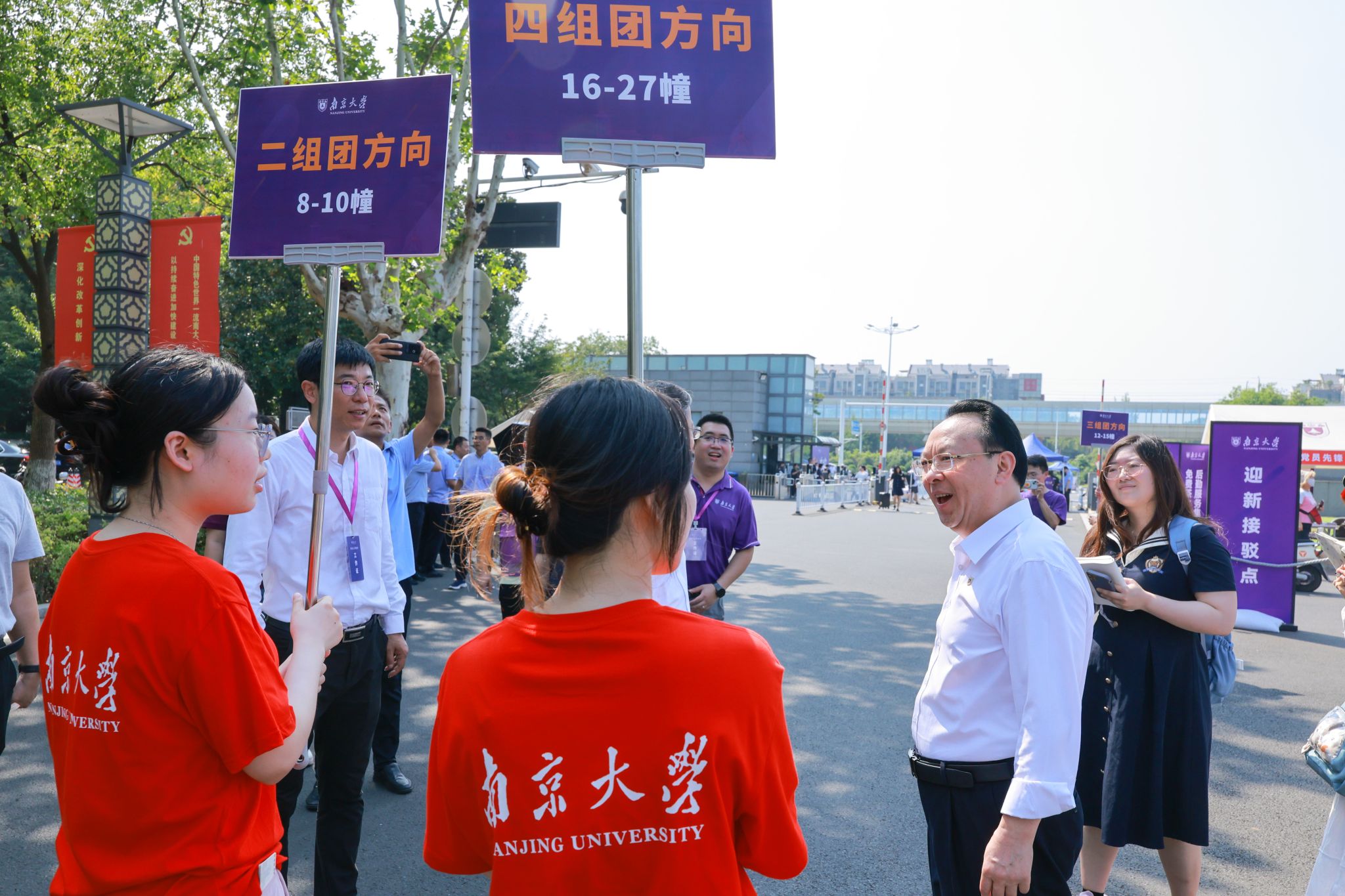 校党委书记、中国科学院院士谭铁牛走访仙林校区迎新接待站、学院报到处、学生宿舍等地,看望新生和送学家长,现场考察迎新工作。