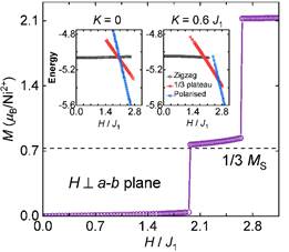 磁化平台的一个显著例子是1/3磁化平台现象,这一现象在S = 1/2的三角晶格反铁磁体中得到了诸多实验观测的证实。在这些量子磁体中,小自旋以及强几何阻挫共同增强了系统中的量子涨落。虽然1/3磁化平台的研究已经扩展到其他具有更高自旋的三角晶格系统以及笼目晶格等其他几何阻挫系统,但是在蜂窝晶格反铁磁体中一直缺少明确的实验证据。由于阻挫是分数磁化平台相的前提条件,不具有几何阻挫的蜂窝晶格中是否会出现分数磁化平台、以及如果确实出现了,如何理解它仍然是悬而未决的问题。