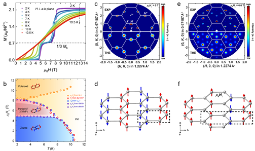 图1. a, Na3Ni2BiO6的磁化曲线;b, 磁相图;c 和 e分别为零场和平台相的弹性散射磁结构因子(上半部分为中子实验结果,下半部分为计算结果);d和f为磁结构示意图。
