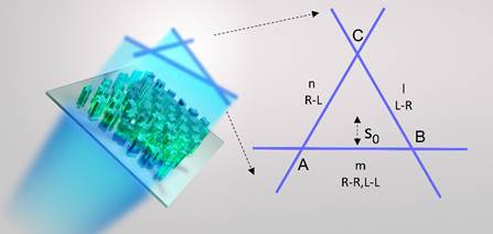 三通道手性超构表面直接实现偏振测量。不同于其他工作基于不同超构表面测量不同偏振的强度来解算斯托克斯参量,研究人员提出通过单超构表面直接测量强度和相位来解算偏振信息。研究人员在原先手性超构表面的基础上(Nano Lett. 21,1815 (2021), Optica, 9, 1314 (2022))进一步设计了一种三个偏振通道复用的手性超构表面,可独立调控两个正交圆偏振通道(R-L & L-R)和一个同偏振通道(R-R/L-L)。如图1所示,三个偏振通道分别形成三条聚焦线,通过聚焦线的强度可计算圆偏振基矢的强度对比,通过考察交点的强度则可推算出圆偏振基矢之间的相位差,从而解算偏振信息。其中手性超构表面的三通道偏振复用能力为实现高空间分辨率的偏振测量奠定了基础。