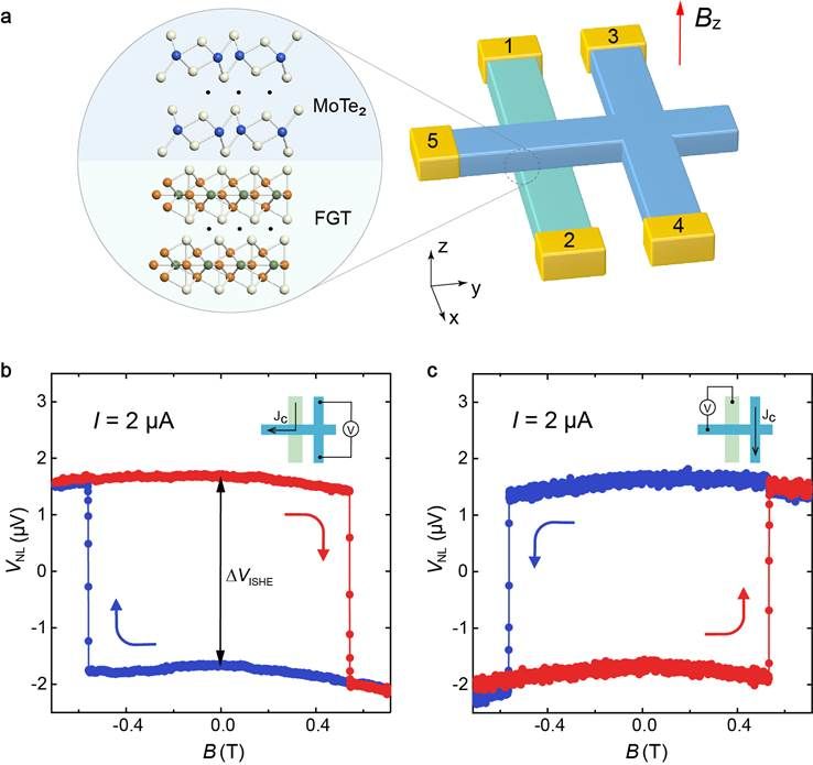 图1:非局域输运测量构型与自旋霍尔效应表征。a.FGT/MoTe2器件构型示意图。磁场方向沿z方向,各电极用数字标识。b.逆自旋霍尔信号随磁场的变化。c.自旋霍尔信号随磁场的变化。
