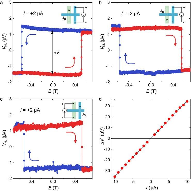 图2:磁自旋霍尔效应非局域测量表征。a.磁自旋霍尔效应测量构型与测量结果。b.改变注入电流方向测磁自旋霍尔效应所得结果。c.逆磁自旋霍尔效应测量构型与测量结果。d.磁自旋霍尔效应测量信号大小随注入电流线性变化。