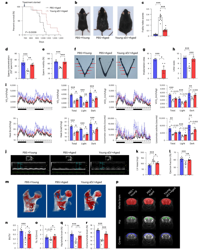 图 1. 注射年轻 sEVs对老年小鼠寿命和全身生理机能的长期影响。每周向老年雄性小鼠(20 个月)静脉注射一次 200 μl PBS 或年轻 sEVs(来源于2个月小鼠),并监测它们的存活时间或全身生理状况。年轻雄性小鼠(2 个月)同时注射 PBS 作为对照组。a、各组的 Kaplan-Meier 生存曲线。b、各组小鼠治疗 7 个月后的外观图像。c、治疗 4 个月后各组的平均虚弱指数评分。d-e、各组的精子计数和活力检测。f-g、与各组雄性小鼠交配的雌性小鼠子宫内可见蓝色带状植入点(胚胎)的数量。h、各组雄性小鼠所生后代的数量。i、各组小鼠氧气消耗量、二氧化碳释放量、产热量和运动频度。j -l、各组小鼠心脏尺寸和心功能指数的超声图。m-o、各组股骨近端小梁微结构的显微 CT 分析。p-r、基于 MRI 的各组海马体和皮层形态计量分析。