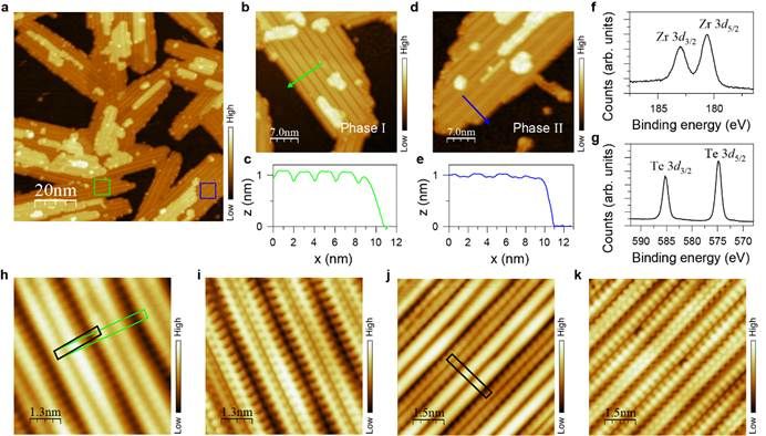 图1 单层ZrTe5的形貌表征。a单层ZrTe5在BLG/SiC衬底上的表面形貌图。(b, d) 分别为相1和相2的形貌放大图。(c, e) 分别为两种相的剖面轮廓线。(f, g) 为单层ZrTe5的XPS测量结果。(h, i) 为相1正负偏压下原子分辨。(j, k) 为相2正负偏压下原子分辨。