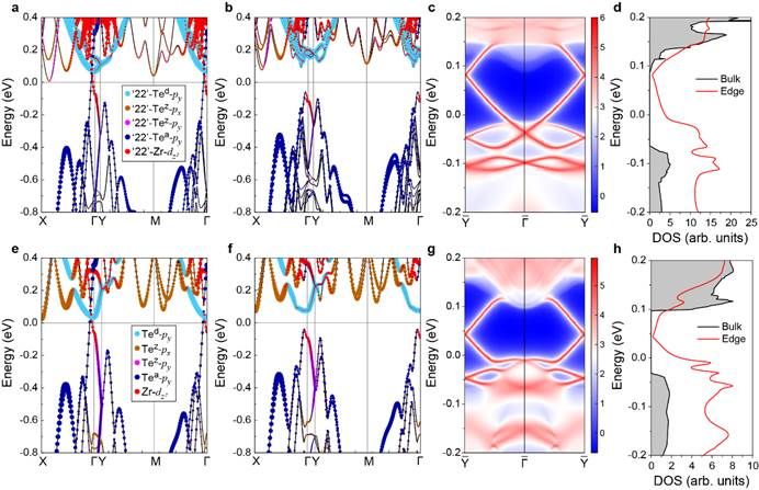 图4 (a, b) 为相1无SOC和有SOC的能带图。 (c) 相1边界能带图。(d) 相1计算的体内和边界的LDOS。(e, f) 为相2无SOC和有SOC的能带图。(g) 相2边界能带图。(h) 相2计算的体内和边界的LDOS。