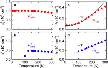 图2 (a)和(c)分别对应D1分量的谱重和散射率随温度的演化。(b)和(d)分别显示D2分量的谱重和散射率随温度的演化。
