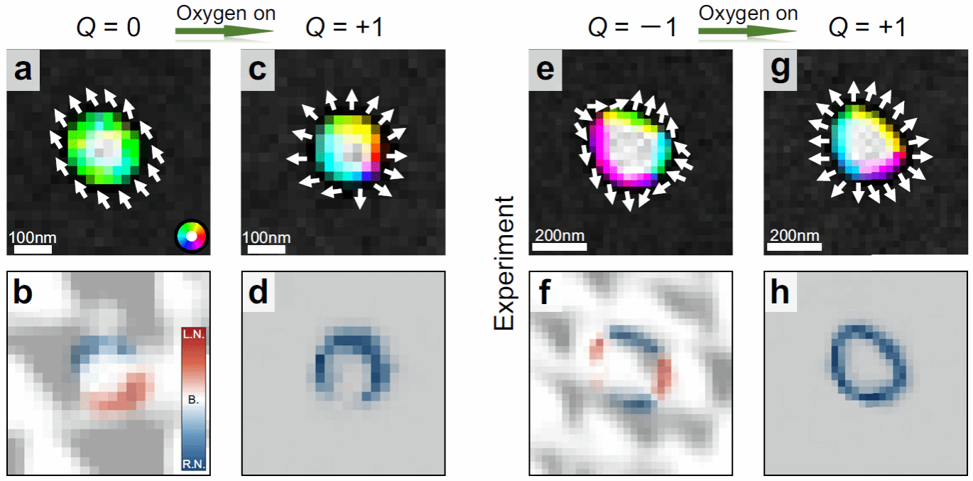 图4|基于氧吸附的拓扑转变。a–b:初始拓扑平庸磁泡的SPLEEM图像及手性分析。c–d:吸附0.2ML氧气后同一区域的图像。e–h:反斯格明子向斯格明子的拓扑转变过程。