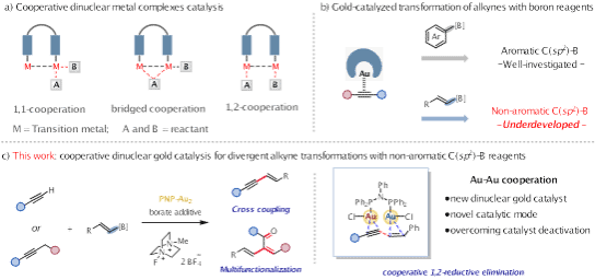 图1.协同双金属催化与双核金协同催化的非芳香性C(sp2)-B试剂转化