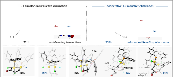 不同于经典的过渡金属催化的有机硼试剂转化,前期的研究表明金催化剂以一种“非经典”的双分子还原消除机制实现对有机硼试剂的催化转化。在这一研究成果的基础之上,通过理论计算对“非经典”的双分子还原消除机制进行验证(TS1b),并提出一种全新的、在能量上更具优势的双金属协同1,2—还原消除机制(TS2b)。在该反应路径中(图2),氮膦配体双核金的两个金原子能够分别定向活化两个底物。轨道分析表明,过渡态TS2b相较于TS1b表现出更弱的反键轨道作用。