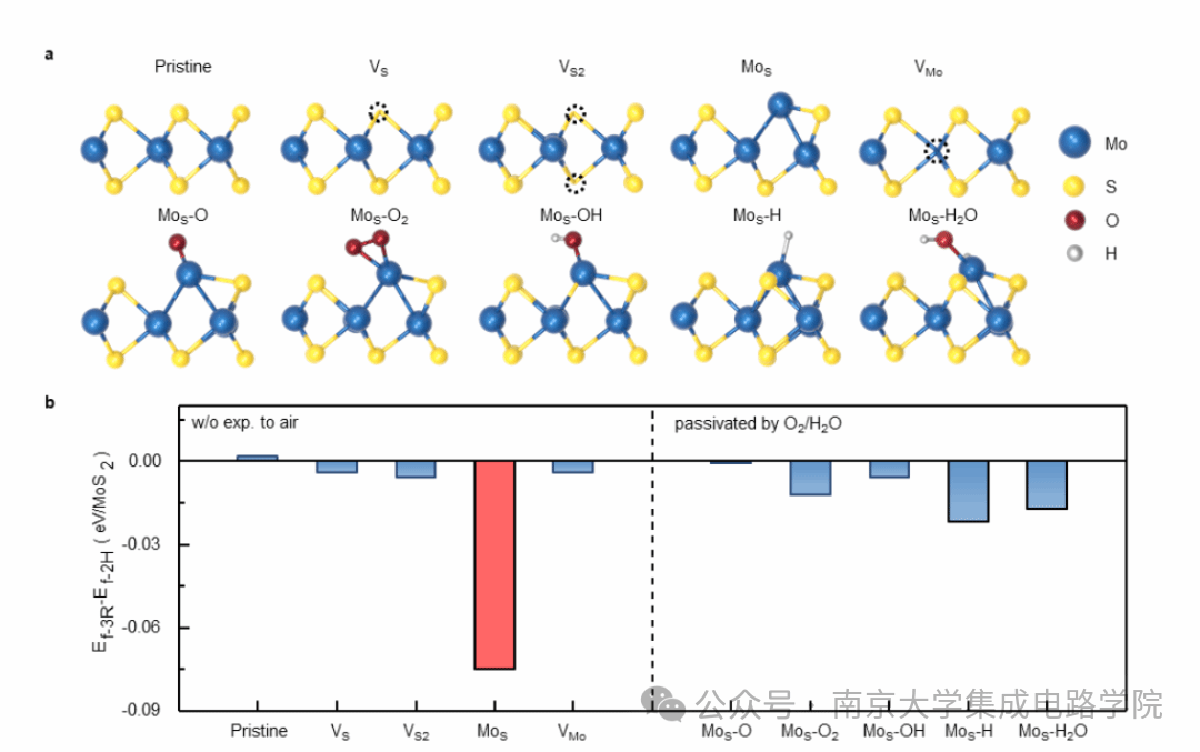 为深入揭示3R相选择性形成机制,研究团队联合东凯发学王金兰教授团队开展理论计算。结果表明晶体缺陷中的Mo替位S缺陷(Mos)能够有效打破2H与3R相的能量简并状态,从而在热力学层面促使3R堆垛优先形核生长。实验上,团队聚焦形核初期阶段,采用高分辨率STEM对<10 nm的团簇进行观测,证实Mos缺陷对3R选择性生长的促进作用(图2)。基于理论与实验的交叉验证,团队提出了同质外延中的缺陷促进选择性形核的生长机制,这一理论的提出,为二维材料的结构调控提供了全新的思路。
