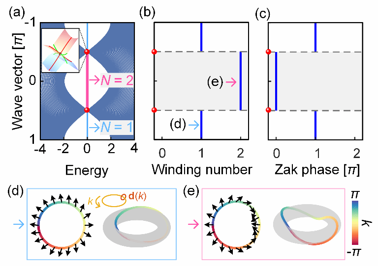 图1. 具有第二类半狄拉克点的拓扑半金属。(a) 投影能带图:蓝/红线分别代表具有一对 (N=1)/两对(N=2)简并的拓扑边界态。插图为第二类半狄拉克点。(b)缠绕数W和 (c) Zak相随动量k的变化。(d) |W|=1时和 (e) |W|=2 时的示意图。