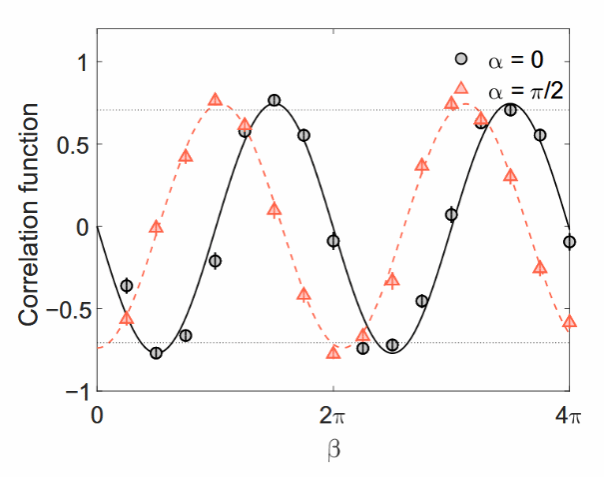 研究团队构建了四光子阻挫干涉装置(图1),并通过后选择机制获得四光子直积态。实验中,研究者分别调控两组相位参数(α, β),对应标准贝尔实验中Alice与Bob两侧的测量设定。团队测得关联函数(图2)所对应的CHSH不等式参数S超出经典上限,统计置信度超过4σ。