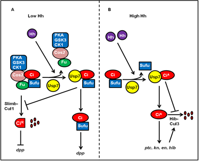 Hh信号通路的活化是通过一系列的级联反应,将信号传递给转录因子Ci/Gli, 最终Ci/Gli激活下游相关基因的表达。因此,对Ci/Gli1 转录因子的稳定性调控,是调节Hh信号活性的重要途径。前期研究已经阐明Ci可以通过两种途径被泛素化降解:Slimb-Cul1介导的细胞质内降解;Hib-Cul3介导的细胞核内降解。众所周知,蛋白泛素化和去泛素化处于动态平衡,从而维持蛋白的稳态。但是,到目前为止,Ci去泛素化酶没有任何报道。我们通过筛选,发现Usp7能正向调控Hh 信号通路活性。Usp7能和Ci相互结合,通过去泛素化来稳定Ci,以达到正调控Hh信号的目的,Hh信号能促进Usp7对Ci的稳定效应。HAUSP是Usp7在哺乳动物里的同源物,它能够代替Usp7的功能,在果蝇体内调控Hh信号通路活性。同时,我们也发现HAUSP能够去泛素化Gli家族蛋白,从而正调控Shh信号通路活性,这充分说明Usp7对Hh信号通路的调控作用在进化中是保守的。这为我们今后在临床上寻找抑制Hh过激活导致肿瘤的药物,提供了一个潜在的靶点。