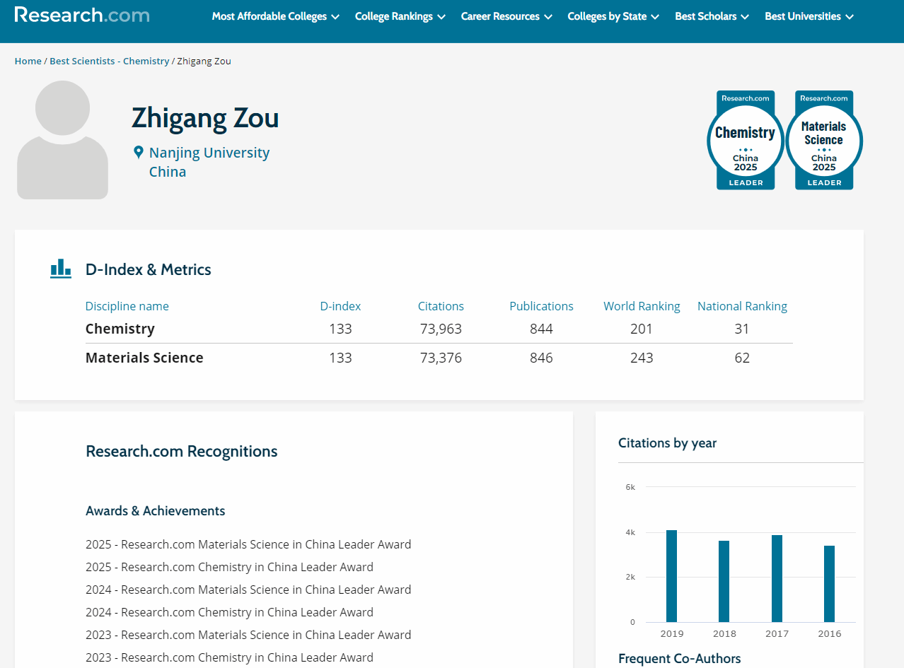 邹志刚教授获Research.com评为化学和材料领域内2025顶尖科学家